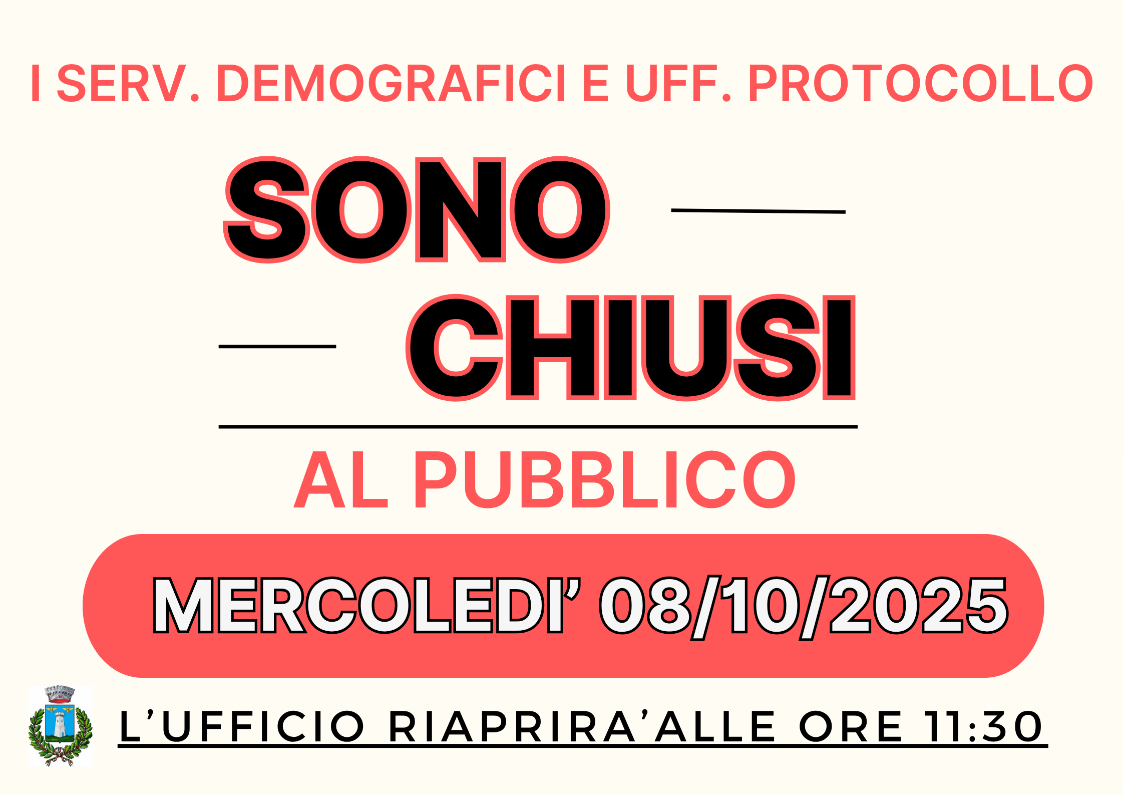 Si informa la cittadinanza che, nella giornata di mercoledì 08/10/2025, l’Ufficio Servizi Demografici e Uff. Protocollo resteranno chiusi al pubblico.