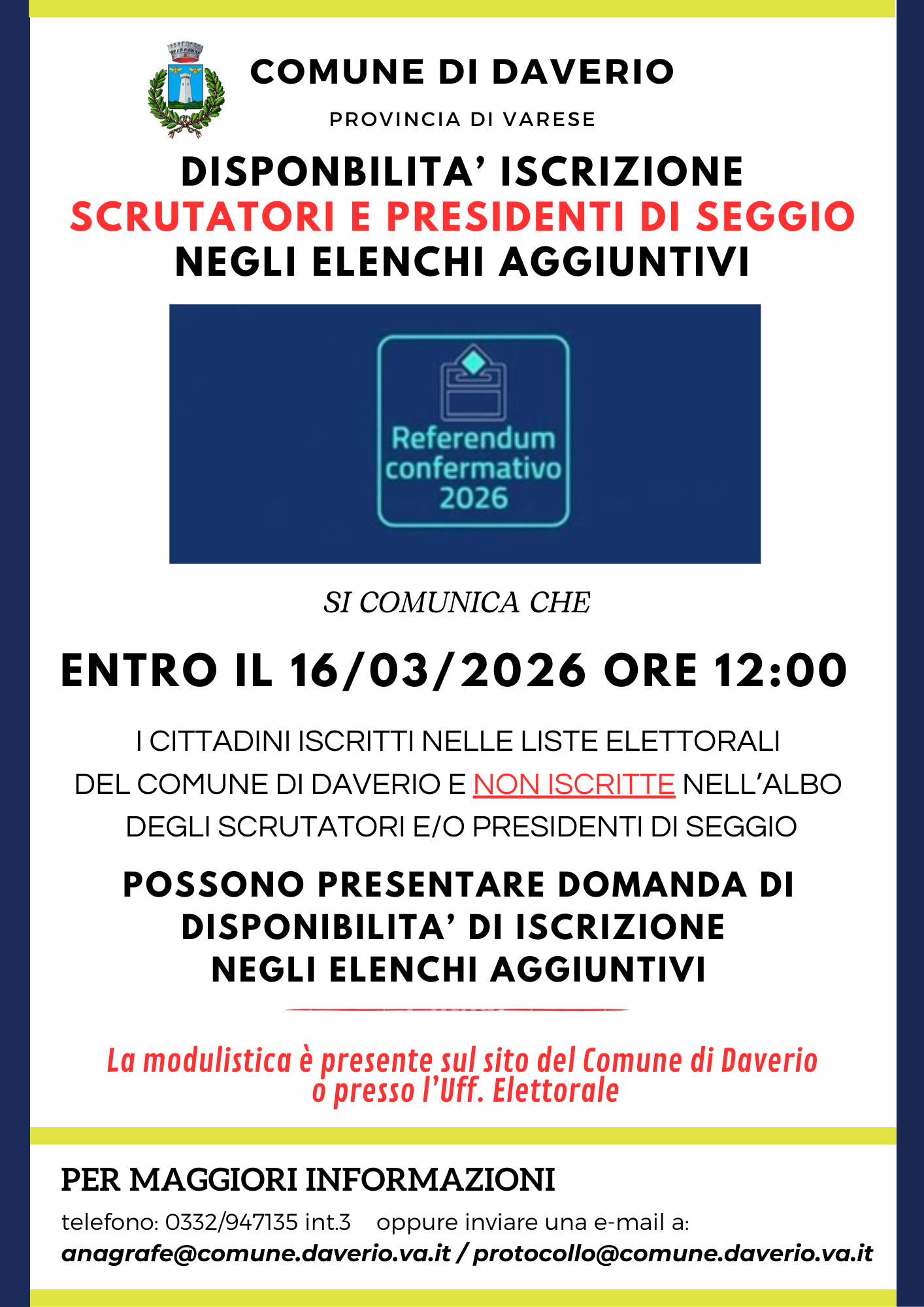 AVVISO : Gli elettori residenti nel Comune di Daverio NON ISCRITTI agli Albi di Presidenti di Seggio o Scrutatori possono richiedere online di essere inseriti in un apposito elenco aggiuntivo per svolgere le funzioni di componente di seggio (Presidente o Scrutatore), in occasione del Referendum del 22-23 marzo 2026, e a subentrare in casi di improvvisa vacanza di quelli originariamente nominati presso gli uffici sezionali. (Circ. Ministero dell’Interno n. 9/2026 del 2 febbraio 2026).